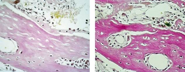 В зоне операции прослеживаются явления образования и дифференцировки тканевых структур, следствием которых является формирование остеоидной ткани в результате действия, прежде всего, клеток остеобластического дифферона. В лакунах трабекул видны остеоциты (рисунок 8).