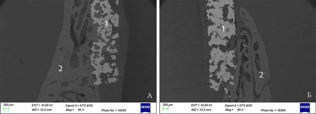 Рис. 9. Спил образцов костей крыши черепа кролика с имплантатом: А- 1 группа, Б- 2 группа. 40-е сутки эксперимента: 1 -имплантат, 2 - кость. Сканирующая электронная микроскопия, BSD режим, ускоряющее напряжение 10 кВ. Увеличение *50