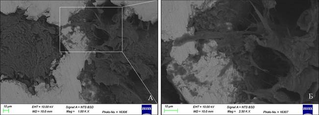 Рис. 10. Спил образца костей крыши черепа кролика с имплантатом. 1 группа, 40-е сутки эксперимента. Сканирующая электронная микроскопия, BSD режим, ускоряющее напряжение 10 кВ. Увеличение *1000-(А), *2500-(Б)