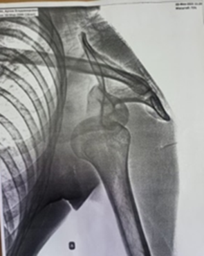 Рис. 1. Первичная рентгенограмма левого плечевого сустава после эпизода повторного вывиха плеча