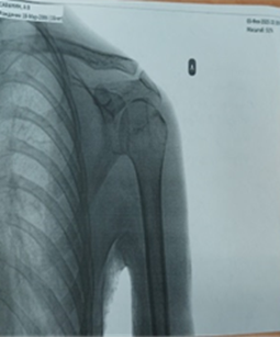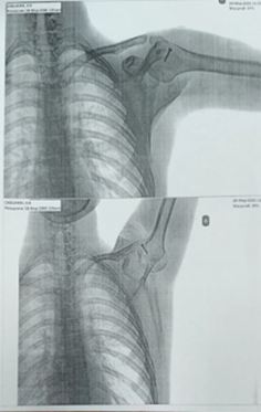После клинического, рентгенологического обследования был выставлен диагноз: Хроническая рецидивирующая передняя нестабильность левого плечевого сустава. Привычный вывих левого плеча (рис. 1). Дежурным травматологом было произведено закрытое вправление вывиха под внутривенным наркозом. Иммобилизация косыночной повязкой. На контрольной рентгенограмме вывих головки плечевой кости вправлен (рис. 2).