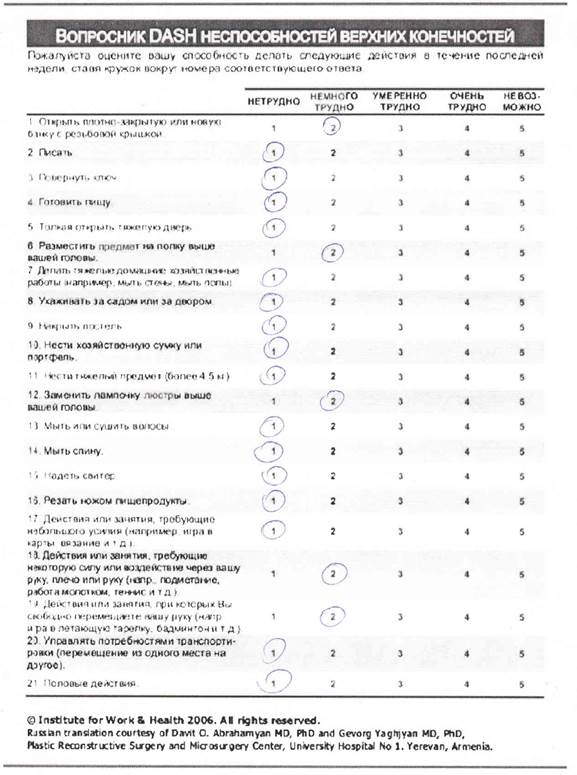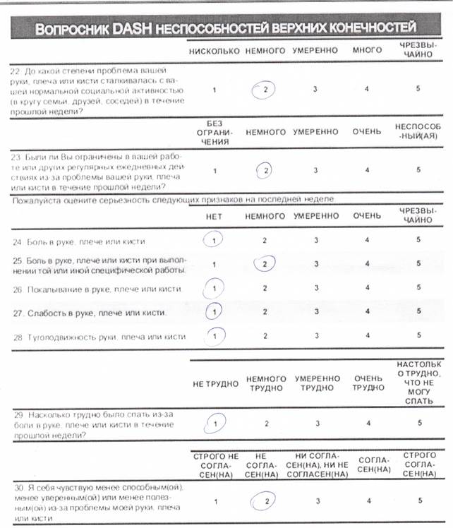 Рис. 5. Опросник DASH для оценки функции верхней конечности. Заполнен пациентом через 6 месяцев после проведенного лечения