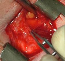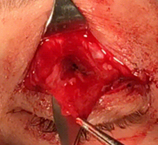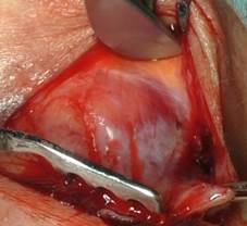 Рис. 2. Выделение плотной части апоневроза для фиксации к верхнему краю тарзальной пластинки
