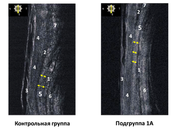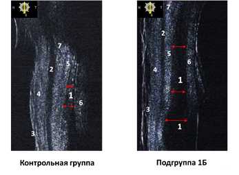 У 18 пациентов с жировой дистрофией (1Б) при УБМ визуализирована утолщенная мышца Мюллера (0,36 ± 0,045 мм) по сравнению с нормальным веком (0,23 ± 0,027мм), кроме этого, апоневроз леватора (0,167 ± 0,035мм) имел незначительное истончение (табл. 2, рис. 5). Макроскопическая интраоперационная ревизия и гистологическое исследование соответствовали данным УЗИ.