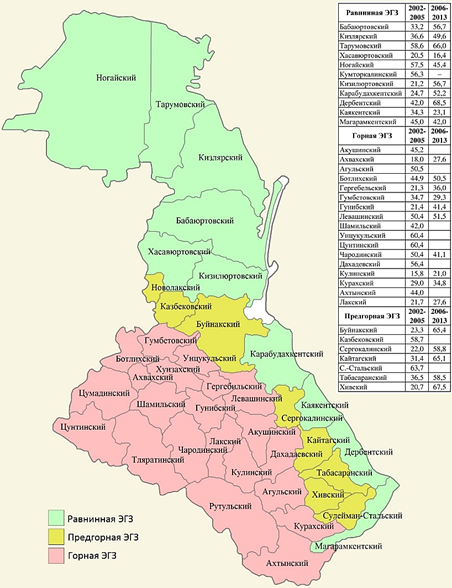 Республика Дагестан, являющаяся частью Северо-Кавказского федерального округа, характеризуется сложной структурой, включающей три ярко выраженные эколого‑географические зоны (ЭГЗ): равнинную, предгорную и горную. Эпидемиологические исследования, проведенные в начале 2000-х годов, демонстрировали критическую ситуацию: частота ЭЗ в РД достигала 46,0-50,4% при медиане экскреции йода с мочой (Ме) всего 15,3 мкг/л, что соответствует тяжелому йододефициту [6; 7].