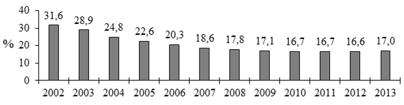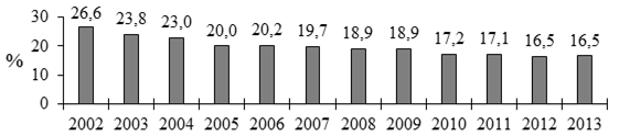 Результаты многолетнего мониторинга эпидемиологического анализа хронического ЙДФ в Республике Дагестан представлены на рисунке 1. На равнинной ЭГЗ 27,0% территорий относились к зоне тяжелого ЙДФ, остальные районы – к зонам умеренного или легкого дефицита. Распространенность ЭЗ среди мальчиков здесь колебалась от 26,6% (2002 г.) до 16,5% (2013 г.), демонстрируя положительную динамику, вероятно, связанную с проводимыми профилактическими мероприятиями (рис. 2). При этом общая распространенность ЭЗ в популяции в 2013 году оставалась более высокой – 31,3%.