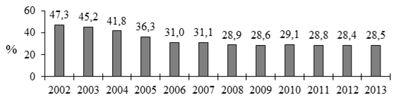 В горной ЭГЗ, где 29,0% территорий были отнесены к зоне тяжелого ЙДФ (рис. 1), частота ЭЗ среди мальчиков 11-13 лет была максимальной: 47,3% в 2002 г. и 28,5% в 2013 г. (рис. 3). В общей популяции этот показатель в 2012 году достигал 52,0%.