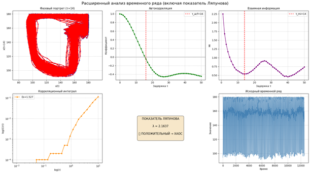 Наибольший показатель Ляпунова (λ), характеризующий скорость экспоненциального расхождения близлежащих траекторий, вычислялся по модифицированному алгоритму Вольфа для коротких и зашумленных временных рядов. После реконструкции фазового пространства с размерностью вложения m = 2 для каждой точки определялась ближайшая не временная соседняя точка с последующим отслеживанием средней скорости расхождения траекторий на 100 итерациях.