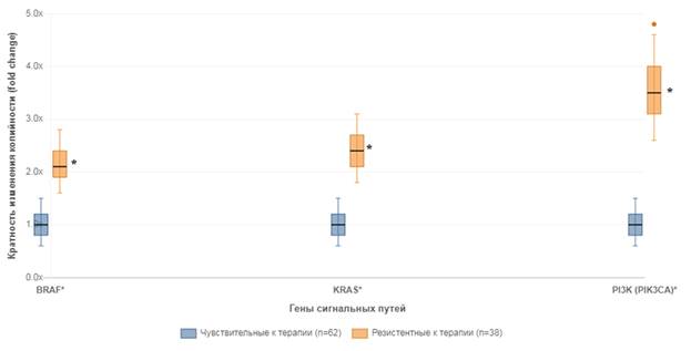 Анализ копийности генов во внеклеточной ДНК выявил статистически значимые различия между группами. У пациентов с резистентностью к терапии наблюдалось достоверное увеличение копийности: гена BRAF в 2,1 раза (p<0,001), гена KRAS в 2,4 раза (p<0,001) и гена PI3K (PIK3CA) в 3,5 раза (p<0,001) по сравнению с внДНК группы чувствительных к терапии пациентов (рис. 1).