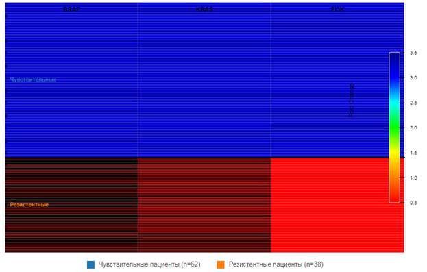 Рис. 2. Тепловая карта относительной копийности генов BRAF, KRAS и PI3K у 100 пациентов с меланомой кожи. Пациенты сгруппированы по ответу на терапию: первые 62 пациента - чувствительные к терапии, последующие 38 - резистентные. Составлено авторами по результатам данного исследования