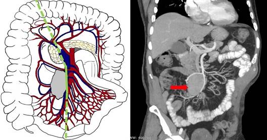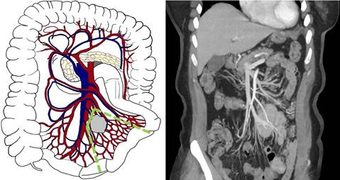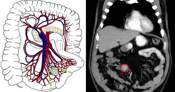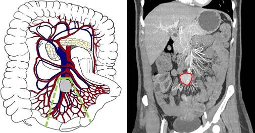 Рис. 3. Третий А тип (уровень III) - локализация брыжеечных метастазов на уровне или дистальнее отхождения a. et v. ileocolica, без вовлечения ствола ВБА/ВБВ