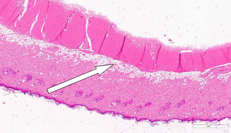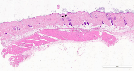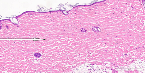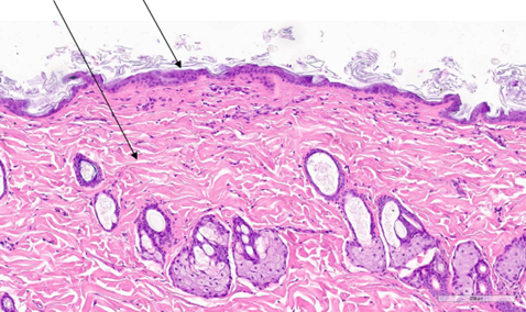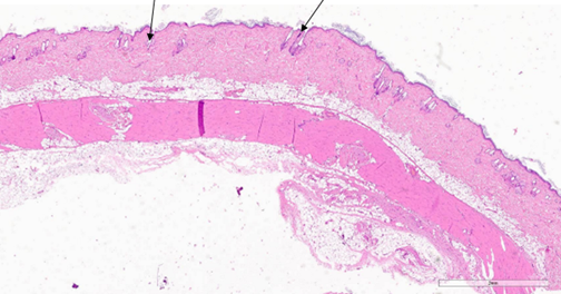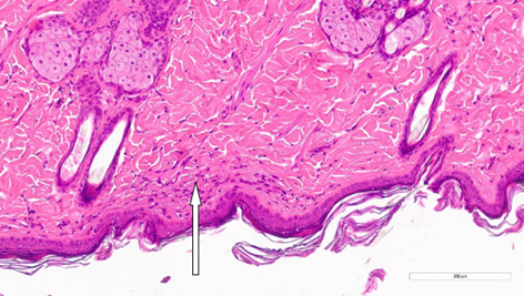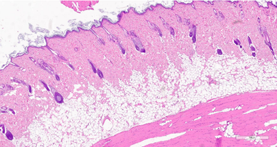Серийные парафиновые срезы толщиной 3мкм готовили по стандартной методике и окрашивали гематоксилином и эозином. Для выявления в тканях коллагеновых волокон использовали гистохимический метод трихромного окрашивания по Массону. В ходе микроскопического исследования определяли толщину и сохранность эпидермиса, структуру дермы, наличие сально-волосяных комплексов и воспалительного инфильтрата для дальнейшего проведения патоморфологического исследования.