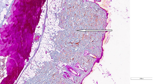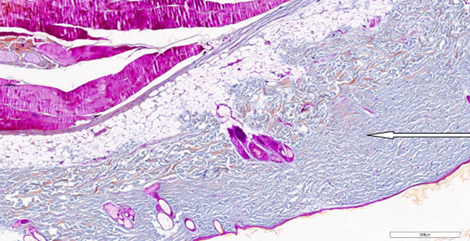 Гистологическая картина, полученная по результатам микроскопического исследования образцов на 47-й день, отражала более показательные изменения, свидетельствующие о пролонгированном действии аппаратов. Так, у всех экспериментальных животных во второй контрольной точке наблюдалось истончение эпидермиса, сопровождавшееся развитием выраженного фиброза дермы у 2особей из каждой группы. Микроскопическое исследование образцов особей из группы1 при малом увеличении (х5) демонстрирует выраженное уменьшение количества сально-волосяных комплексов вплоть до полного их исчезновения при отсутствии атрофии. При большем увеличении (х400) гистологическая картина характеризуется уплотнением сетчатого слоя дермы при наличии фиброза. После окрашивания по Массону просматривается сосочковый слой дермы, представленный плотно упакованными коллагеновыми волокнами (рис.5–7).