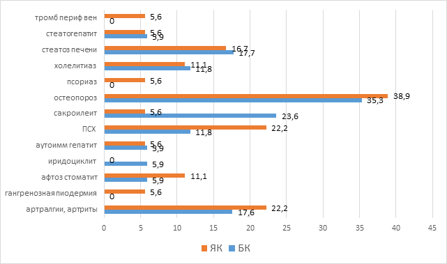 Согласно выделяемым категориям ВКП у пациентов, в настоящем исследовании из ВКП аутоиммунной природы, связанных с активностью заболевания, преобладали артриты и артралгии (х2 =0.114, р=0.74), с меньшей частотой встречались афтозный стоматит (х2=0.305, р=0.58), гангренозная пиодермия (у пациентов с ЯК, х2=0.972, р=0.32), иридоциклит (у пациентов с БК, х2, р=0.30), аутоиммунный гепатит (редко, с одинаковой частотой - х2=0.016, р=0.89), поражения кожи (рис. 2). Из аутоиммунных ВКП, не связанных с активностью заболевания, регистрировались: с наибольшей частотой – остеопороз (с одинаковой частотой - х2=0.048, р=0.83) и ПСХ (с преобладающей частотой у пациентов с ЯК - х2=0.673, р=0.41), сакроилеит (преимущественно у пациентов с БК - х2, р=0.13), псориаз – в единичных случаях при ЯК (рис. 2). В группе ВКП, обусловленных длительным воспалением и метаболическими нарушениями, преобладали стеатоз печени (с одинаковой частотой - х2=0.006, р=0.94) и стеатогепатит (с одинаковой частотой - х2=0.016, р=0.89), холелитиаз (с одинаковой частотой - х2=0.004, р=0.95); тромбоз периферических вен встретился в единичных случаях у пациентов с ЯК (рис. 2).