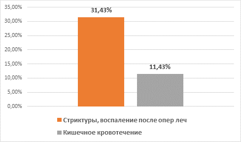 Из осложнений в изучаемой выборке (рис. 3) преобладали кишечные кровотечения, воспалительные и спаечные процессы (как исход хронического послеоперационного воспаления), с существенно меньшей частотой встречались кишечные кровотечения (как связанные с послеоперационным периодом, так и спонтанные), что не противоречит литературным данным [19].