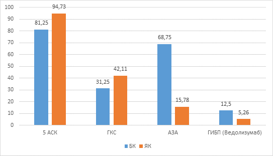 Рис. 4. Терапия, предшествующая поступлению в стационар (сведения из анамнеза пациентов). Использованные сокращения: 5 АСК – препараты 5-аминосалициловой кислоты, ГКС – глюкокортикостероиды, АЗА – азатиоприн, ГИБП - генно-инженерные биологические препараты. Примечание: составлено авторами по результатам исследований