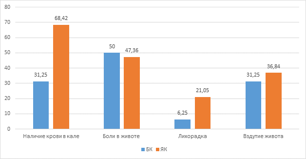 Болезненность при пальпации живота отмечалась у 37,5% пациентов с БК и 47,37% пациентов с ЯК, преимущественно в правом и левом фланках и подвздошных областях. Также у наблюдаемых пациентов варьировалась масса тела – избыток массы или ожирение (по ИМТ) диагностированы у 25% пациентов с БК и 21,05% пациентов с ЯК, недостаточность питания – у 12,5% с БК и 10,52% - с ЯК.
