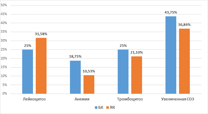 При проведении лабораторных исследований лейкоцитоз отмечался у 25% пациентов с БК и 31,58% - с ЯК, анемия – у 18,75% и 10,53% соответственно, тромбоцитоз – у 25% и 21,1% соответственно, выраженное увеличение СОЭ при поступлении в стационар – у 43,75% и 36,84% соответственно (рис. 7).