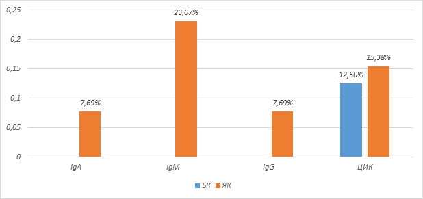 Иммунологические исследования выявили повышение IgA у 7,69%, IgМ у 23,07%, повышение IgG общего у 7,69% обследованных пациентов с ЯК, у обследованных пациентов с БК эти показатели находились в пределах нормальных величин. В 15,38% случаев у обследованных пациентов с ЯК и в 12,5% случаев у обследованных пациентов с БК выявлено повышение концентрации циркулирующих иммунных комплексов (ЦИК) (рис. 8).