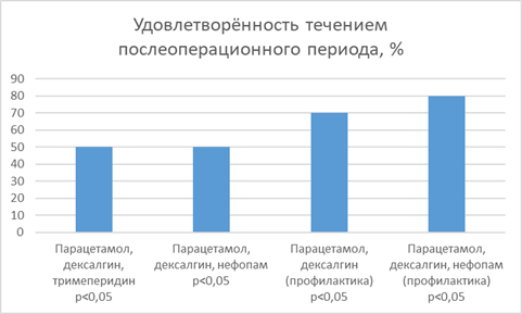 Таким образом, из выбранных способов коррекции болевого синдрома наибольшую эффективность показала комбинация парацетамола и декскетопрофена перед оперативным вмешательством с началом введения нефопама сразу после начала оперативного вмешательства в виде продленной инфузии.