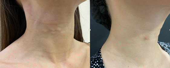 Рис. 1. Осложнение после введения инъекционного тканевого наполнителя на основе полимолочной кислоты: гранулемы области шеи. Слева: вид до лечения (через 8 месяцев после введения инъекционного тканевого наполнителя). Справа вид после (через 1 месяц после курса лечения - 3 инъекции аутологичной богатой тромбоцитами плазмотерапии). Составлено авторами по результатам данного исследования