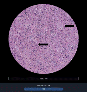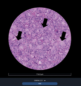 Рис. 4. Патоморфологические изменения в гранулеме дермы области шеи пациентки К., 42 лет (фиксация материала в 10%-ном нейтральном формалине, парафиновый срез 5 мкм), до курса плазмотерапии. Световая микроскопия. Окраска гематоксилином и эозином. Увеличение ×200. Репрезентативный биоптат до лечения. Визуализируется классическая гранулема инородного тела с плотным лимфо-гистиоцитарным инфильтратом, многочисленными гигантскими клетками инородных тел (черные стрелки) с округлыми включениями (соответствуют морфологии частиц инъекционного тканевого наполнителя). Составлено авторами по результатам данного исследования