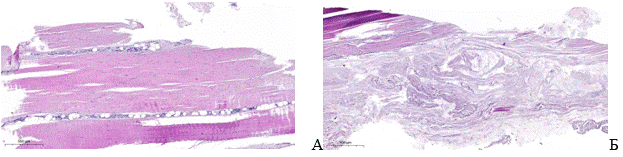 Рис. 2. Гистологическая картина пациентов с дегенеративными изменениями СЗББМ: А – пациент К. 26 лет, Bonar – 2 балла; Б – пациент Л. 30 лет, Bonar – 8 баллов.