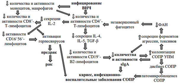 Причинно-следственные связи дефицита sIgA в слюне с развитием патомикробиоценоза у ВИЧ-инфицированных лиц схематично показано на рисунке. Формирование подобных «порочных кругов» представляется потенциально возможным и в других случаях тотальной иммуносупрессии.