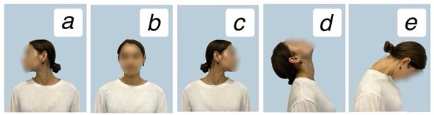 Рис. 1. Позиционирование головы обследуемого во время выполнения магнитно-резонансной томографии: a - поворот головы вправо; b - стандартное анатомическое положение; c - поворот головы влево; d - максимальное разгибание шеи; e - максимальное сгибание шеи