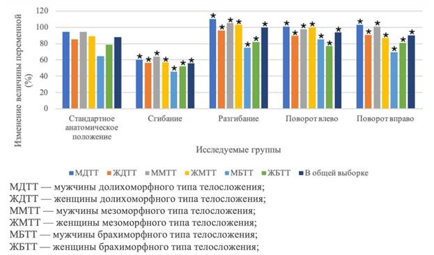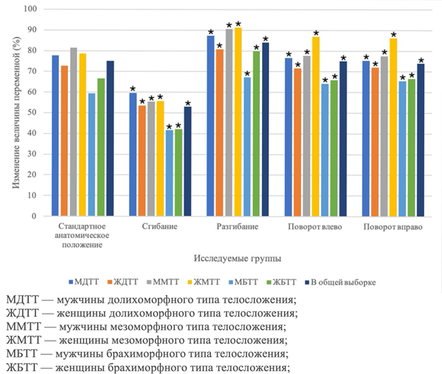 Проведенным исследованием установлено, что при физиологических движениях головы пол и тип телосложения обследованного лица влияют на расстояние от контрольных точек на щитовидном и перстневидном хрящах гортани, которые являются основой её скелета, до опорной, относительно стабильной при движениях шеи, точки на яремной вырезке рукоятки грудины. У мужчин и женщин всех типов телосложения сгибание шеи приводит к уменьшению расстояния от реперной точки в области яремной вырезки грудины до избранных контрольных точек на правой и левой поверхностях щитовидного хряща и контрольной точки на середине дуги перстневидного хряща. У лиц мужского пола долихоморфного телосложения величина этих изменений максимальна (группа МДТТ). Самое значительное уменьшение расстояния от центра яремной вырезки грудины до латеральной точки на щитовидном хряще слева в этой группе составляет 36,8% (39,9 мм).