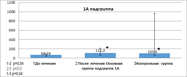 Как видно из данных рисунка 2, до начала терапии у всех пациентов было выявлено достоверное снижение показателя TRAIL (68,29(41,34;94,78) в сыворотке крови в сравнении с группой контроля (103,6(58,24; 964,9), p=0,04). После проведенной терапии в подгруппе 1А наблюдалось достоверное повышение показателя TRAIL (111,3(62,64; 210,9), p=0,04).