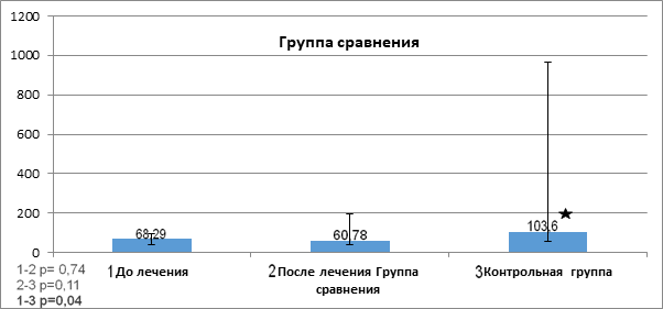 Рис. 4. Показатели фактора роста TRAIL (отн. ед.) в сыворотке пациентов до и после проведенной терапии в группе сравнения