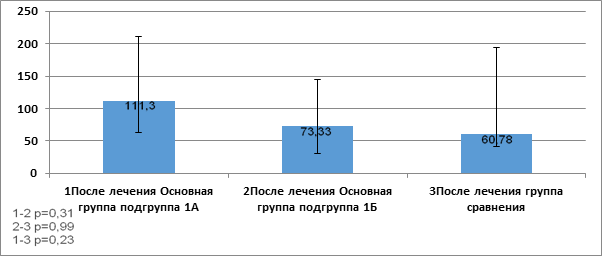Как видно из данных рисунка 5, после проведенной терапии показатель TRAIL повысился в основной группе по сравнению с группой сравнения (60,78 (40,72; 193,7). Необходимо отметить, что показатель TRAIL (111,3 (62,64; 210,9)) в сыворотке крови пациентов подгруппы 1А был значительно выше показателя у пациентов подгруппы 1Б основной группы (73,33 (30,73; 144,7), но не имел статистической разницы (р> 0,05).