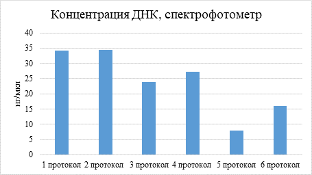 Рис. 1. Значения концентрации ДНК, выделенной разными протоколами (составлено авторами по результатам данного исследования)