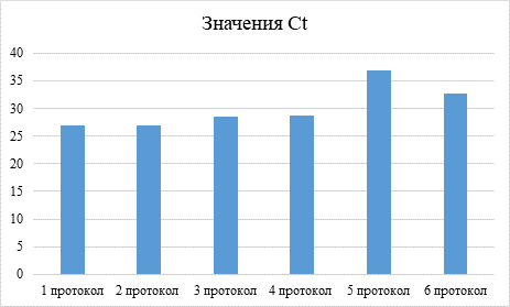 При постановке ПЦР наиболее ранние выходы получены на образцах, выделенных 1 протоколом, Ct составляет 26,95±1,41 (ДИ 95%: 26,53 – 27,36) и 2 протоколом – 26,85±0,94 (ДИ 95%:26,53 – 27,36). Поздние значения показали протоколы 5 и 6 – 36,75±1,37 (ДИ 95%:36,3 – 37,14) и 32,77±0,72 (ДИ 95%:32,56 – 32,98) соответственно (рис. 3).