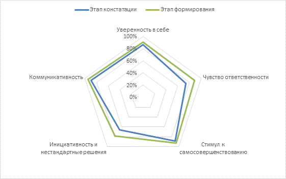 Наибольшая динамика в развитии всех исследуемых субъектных качеств студентов убедительно демонстрируется в областях ответственности, инициативности и принятия нестандартных решений, что свидетельствует об эффективности проектной деятельности в данных направлениях. Несмотря на то, что рост показателей по остальным аспектам (уверенность в себе, коммуникативность, стимул к самосовершенствованию) оказался менее выраженным, он также является положительным, что в совокупности подтверждает успешное воздействие проведенных формирующих мероприятий.
