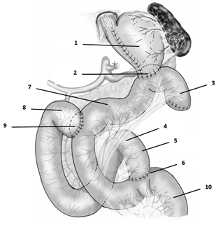 1 – культя желудка; 2 – гастроеюноанастомоз; 3 – аборальный конец пересеченной тощей кишки; 4 – дуоденоеюнальный переход; 5 – приводящий (оральный) отдел тощей кишки; 6 – еюноеюноанастомоз; 7 – отводящая петля тощей кишки; 8 – двенадцатиперстная кишка; 9 – дуоденоеюноанастомоз; 10 – отводящий отдел Ру-петли