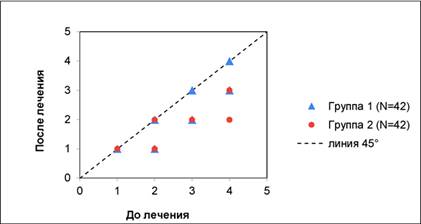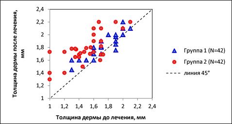 Рис.1. Изменение толщины дермы в проекции рубца в группах исследования. Положение точки выше пунктирной линии указывает на увеличение значения, ниже пунктирной линии– на уменьшение значения, на пунктирной линии– на отсутствие изменения значения