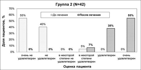 После лечения различие оценок по шкале FACE-Q между группами исследования достигло статистической значимости (р<0,001). Несмотря на то, что 62% пациентов в группе1 указали на некоторую степень удовлетворенности результатами коррекции, были и те (38%), кто остался в определенной мере неудовлетворен лечением. При этом в группе2 результатами коррекции были удовлетворены все пациенты, в том числе «очень удовлетворены» (55%) и «удовлетворены» (38%).