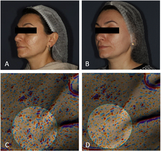 Рис.8. Атрофические рубцы, возникшие после акне. Фотография A)до лечения и B)после лечения (пациентка 39лет, группа2). Визуализация рубца на аппарате Antera3D® C)до лечения и D)после лечения
