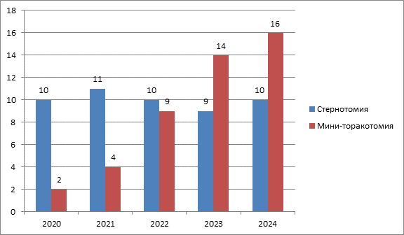 Заметим, что за пятилетний период частота применения мини-доступа ощутимо увеличилась. В 2020 году из 403 операций в условиях искусственного кровообращения всего две были выполнены из мини-торакотомического доступа, что составило незначительные 0,5% от общего количества операций. К концу 2024 года число операций, выполненных из мини-торакотомического доступа, достигло 16, что составляет уже 4,5% от всех 356 хирургических вмешательств.