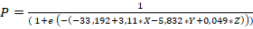 С использованием метода пошагового включения в регрессионную модель также получено уравнение прямой с тремя предикторами, имеющими больший вклад в вероятность возникновения миопии, и определена константа логистической регрессии. Уравнение имеет следующий вид:
