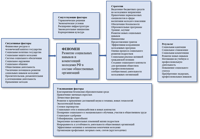 Представленные тремя группами факторы обеспечения организационно-педагогических условий и создания молодежной образовательной среды в пространстве общественных организаций и движений в комплексе будут способствовать вовлечению подростков в реализацию общественных проектов, включая их в общественную жизнь и творчество, позволяя охватить большинство юношей и девушек, пробуждая интерес к окружающему культурному пространству, мотивируя личностное развитие (социальные, коммуникационные, лидерские, организаторские качества и умения). Первая группа ситуативных факторов вовлечения подростков в социально значимую деятельность состоит из: 1) проводимой политики образования и социальной защиты молодежи, 2) материальных и человеческих ресурсов, 3) сетей и сред социального общения и развития, 4) осуществляемой общественной деятельности, 5) потенциала развития социальных навыков подростков на основе применения наиболее эффективных методов просветительства, агитации и продвижения. Вторая группа представлена сопутствующими факторами: 1) экономические условия, 2) законодательные инициативы, 3) управленческие решения, предусматривающие подростковое самоуправление, 4) расширение инфраструктуры, 5) корпоративная культура. Третья группа выявленных факторов позволяет найти ресурсы, усиливающие работу по массовому вовлечению подростков в общественную деятельность: 1) благоприятная безопасная образовательная среда, 2) привлечение значимых взрослых, 3) личностное развитие и рост, 4) применение достижений науки и техники, новых технологий, 5) сетевое партнерство, 6) взаимодействие в новых контекстах, 7) распространение социального и эмоционального обучения, 8) применение технологии эдьютеймента при создании образовательных продуктов, эффективной механики и механизмов вовлечения молодежи в просоциальную деятельность, 9) усиление социального одобрения, 10) закрепление положительных изменений жизни подростков, 11) обеспечение устойчивости и планомерности деятельности подростковых общественных организаций с возможностью для подростков круглогодично участвовать в профильных лагерных сменах, слетах и пр.