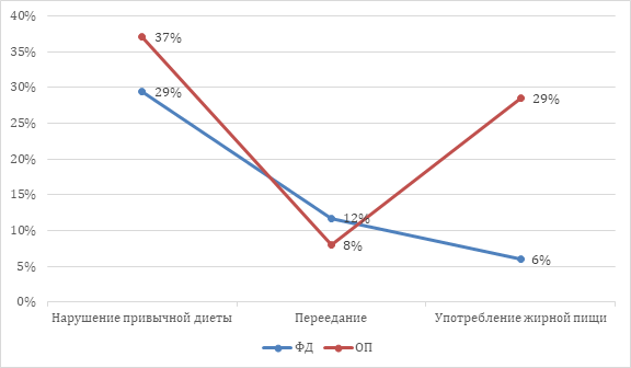 Основными факторами, провоцирующими возникновение болевого синдрома, по данным авторов, являются нарушение привычной диеты и переедание у респондентов с ФД и прием жирной пищи при ОП (рис. 1).