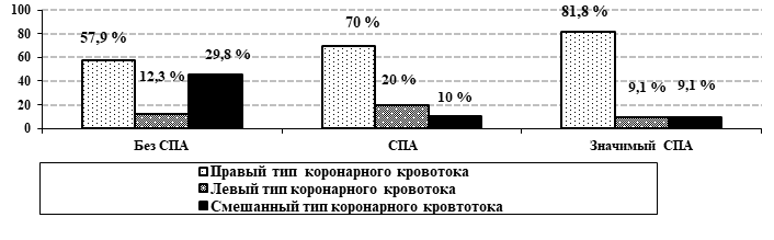 Как видно из рис.1, во всех группах сравнения превалировал правый тип коронарного кровоснабжения – 57,9% (n=33) у пациентов без АСПА, 70% (n=14) – у пациентов с АСПА и 81,8% (n=9) у лиц с гемодинамически значимым АСПА. При сравнении между группами отмечалась лишь тенденция к различию по встречаемости правого типа кровотока между пациентами без АСПА и пациентами с гемодинамически значимым стенозом ПА (χ²=1,34, р=0,18). Левый тип коронарного кровотока наблюдался у 7 (12,3%) пациентов из группы пациентов с ИБС без АСПА и 4 (20%) пациентов с ИБС и АСПА. Смешанный тип коронарного кровотока превалировал у лиц без стеноза ПА 17 (29,8%), тогда как в группе пациентов с АСПА – лишь у 2 (10%) пациентов.