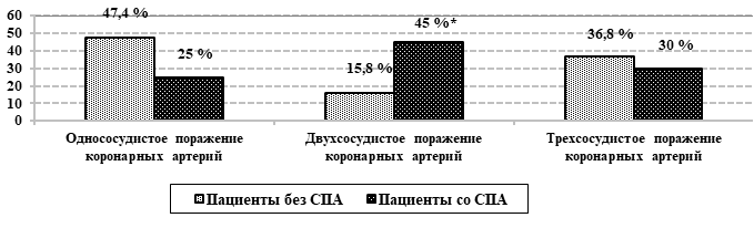 Рис.2. Выраженность атеросклеротического поражения коронарного русла у пациентов с ИБС и АГ в зависимости от состояния почечного кровотока (%) (р < 0,05, СПА – стеноз почечных артерий).