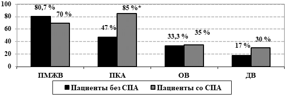 Рис.3. Частота встречаемости поражений коронарных артерий у пациентов с ИБС в зависимости от состояния почечного кровотока (%) (р < 0,05, СПА – стеноз почечных артерий, ПМЖВ – передняя межжелудочковая артерия; ПКА – правая коронарная артерия; ОВ – огибающая ветвь; ДВ – диагональная ветвь).