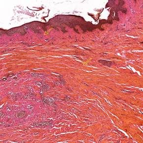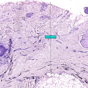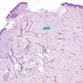 Рис.1. Измерение глубины слоя дермы рубца до проведения лазерной терапии. Окраска: гематоксилин + эозин. Ув. х5.