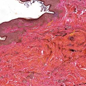 Морфометрический анализ показал наибольшее уменьшение количества пигмента в дерме за счет деструкции и элиминации наиболее крупных участков импрегнации. Уменьшение площади крупных участков составило: в паре №1 – 100%; в паре №2 – 72,5%; в паре №3 – 100%. Аналогичная тенденция зафиксирована для средних и малых по площади участков импрегнации.