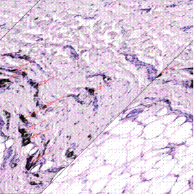 Рис.5. Участки импрегнации в дерме рубца до проведения лазерной терапии